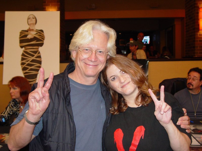 What a sweetheart this guy is! Just look at that huge hug Bruce gave me! He was bending down so we could both fit in the picture ;) (As I was bee-lining toward Bruce's table, the only "V" actor at Chiller Con, I was greeted by fellow "V" fan, Rick. (hi Rick! Nice to have met you!)) While there were no pics from "V" on Bruce's table, his volunteer assistant (the one who takes the $$$ for the autographs) was on the up and up. When I mentioned "V" -- the assistant immediately pulled out a resume sheet and rattled off Bruce's character name, John Langley. Baby KJ was fast asleep in the stroller, so when I "introduced" her to Bruce, he mentioned that he has a 17-month old daughter named Sophie! Bruce's wife is named Michele. Bruce also has another child with previous wife, Lisa. I also asked Bruce if he's ever been to New Jersey and he said he used to have a place in Wildwood but hasn't been to NJ in 30 years! Our time was short because I didn't want to hold up the line of people waiting to get Mr. X-Men's autograph, but I must say, Bruce did not rush me at all. He was quite the gentleman and totally made my day! Some background information on Bruce: Born June 28, 1946 in